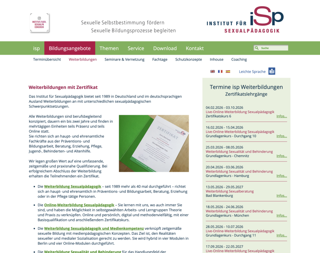 Für eine fachlich fundierte Arbeit in der sexuellen Bildung und in der Prävention sexualisierter Gewalt ist die kontinuierliche Professionalisierung von Fachkräften entscheidend. Auf dieser Seite finden Sie eine sorgfältig ausgewählte Sammlung von Websites, die Fort- und Weiterbildungsangebote in diesen Bereichen bereitstellen.
